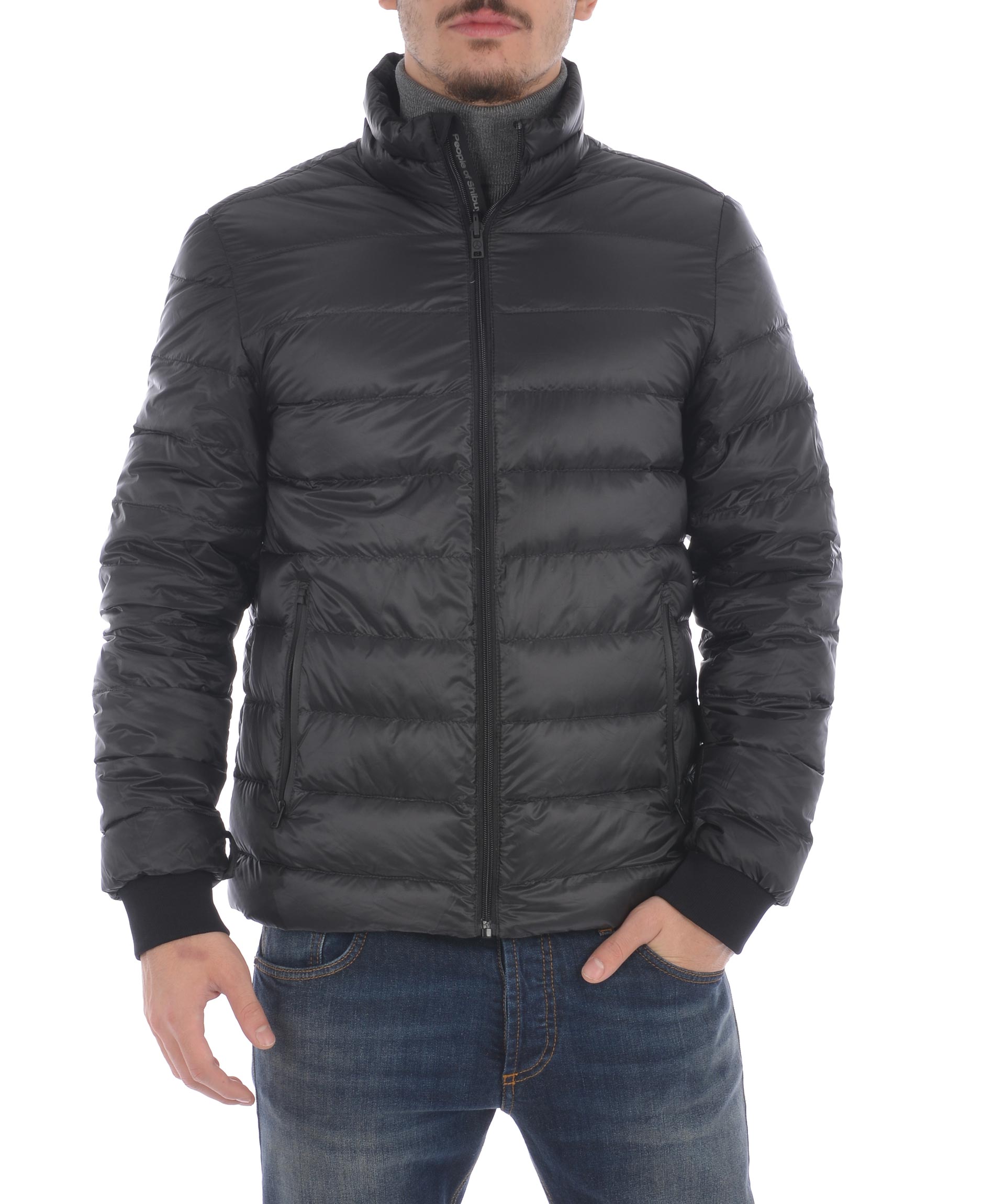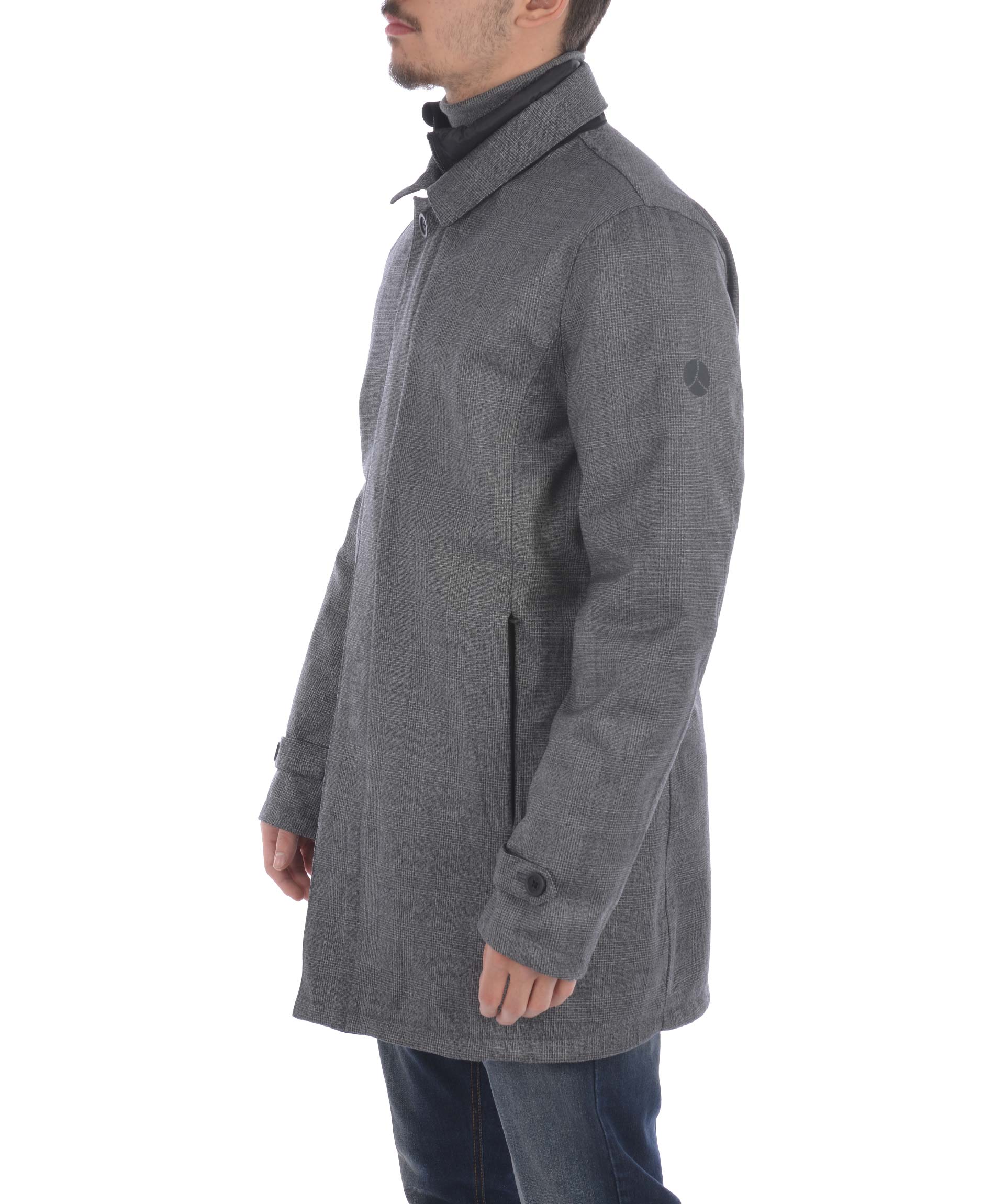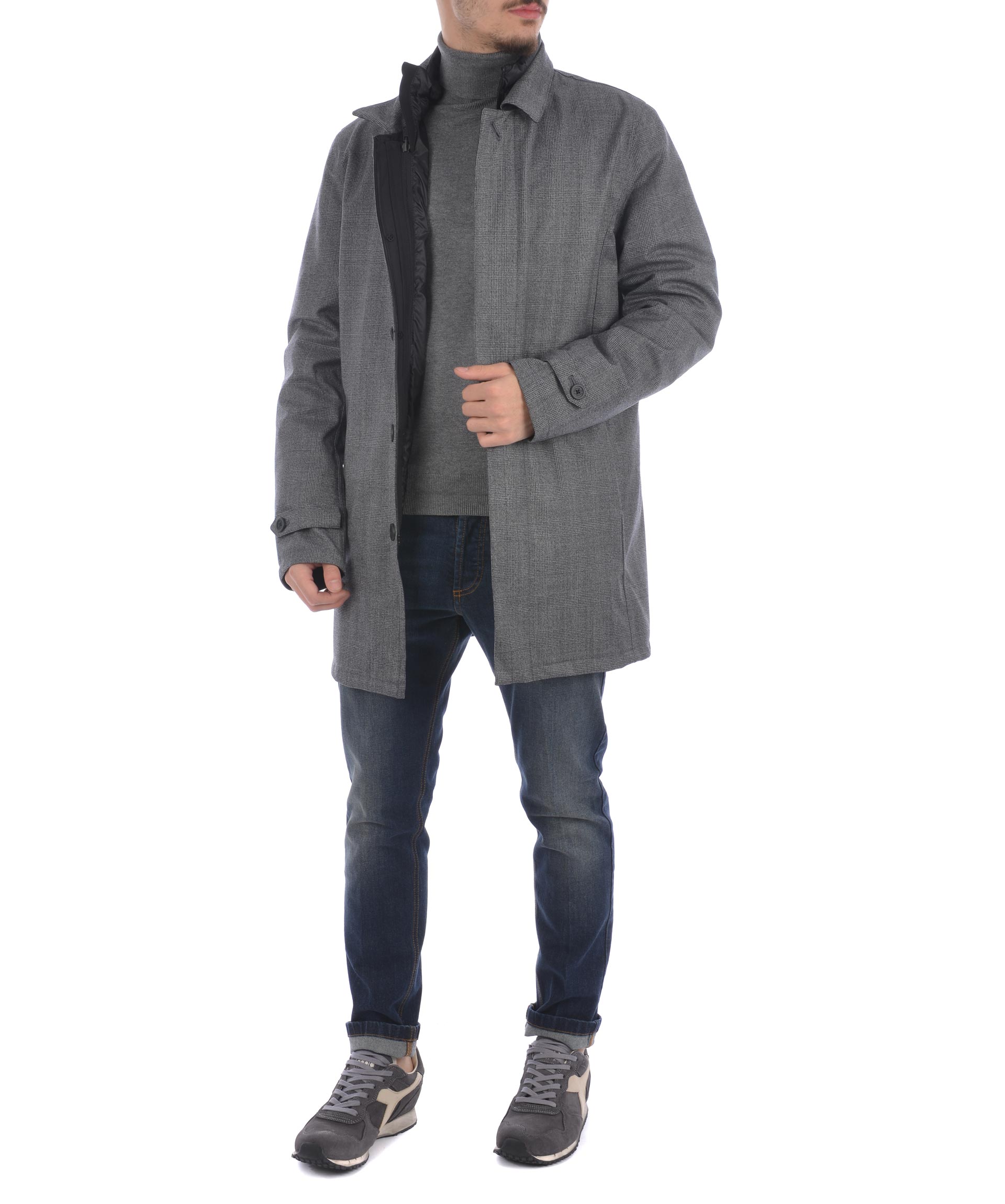 Giaccone People of Shibuya in tela di misto lana principe di galles Grigio scuro . Antipioggia, traspirante. Colletto classico. Chiusura con doppia zip e bottoni coperti da fintone. Tasche frontali con zip. Mostrine ai polsi con bottone ed inserto catarifrangente. Spacco centrale sul retro. Foderato con piumino Nero trapuntato staccabile, imbottito con piume d'oca, tasche con zip e tasche interne, polsini in maglia a costine.
