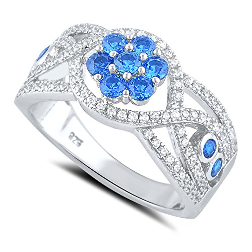 -. Title : Sterling Silver Simulated Blue Sapphire Flower Ring (Size 5 - 9)