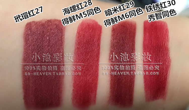 下面这5个色,都是红色系列的,都是热销色,小池也给单独选出来放在一起进行了试色,颜色有红有暗有深有浅,个个都是爆款色。