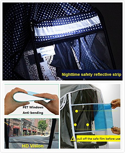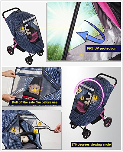 Studio : Hunan province Lixian BEILAIXI maternal and child supplies factory Publisher : Hunan province Lixian BEILAIXI maternal and child supplies factory Binding : Baby Product Product Description SIZE Can be used on small, medium, full size strollers, rear or forward facing strollers and joggers with. Complete Coverage Foot-wrapper can wrap under the foot-rest of the stroller for complete coverage. Elegance Plus weather shield virtually covers the stroller from top to bottom for maximum weather protection. Ventilation Two ventilation system on each side aids air flow into the cover. ntimate protectionI with 99% UV resistant PET material optical windows.protect eyes,More HD. Thickening PET material, more transparent anti-scratch bending scratch Windblow Prevention,Easy Installation Cover is equipped with elastic S-Hooks to secure the cover onto the stroller. It prevents the cover being blown off from strong wind. Simple and easy installation. Storage Pouch Conveniently fold the cover and use the included portable pouch for easy storage and carry when not in use. 0