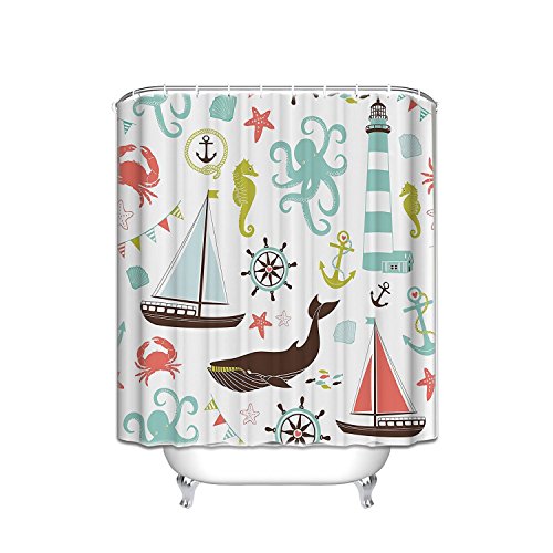 Sea Creatures Rope And Anchor Fabric Bathroom Shower Curtain 60x72 ,Seahorse Whale Shark Octopus Coral Crab Marine Lighthouse Ocean Theme Home Decor Nautical Coastal