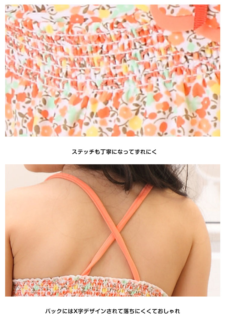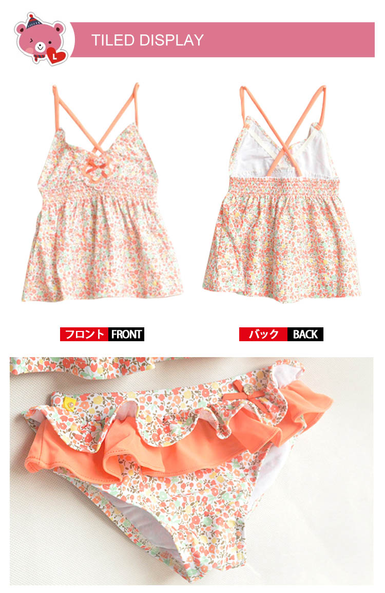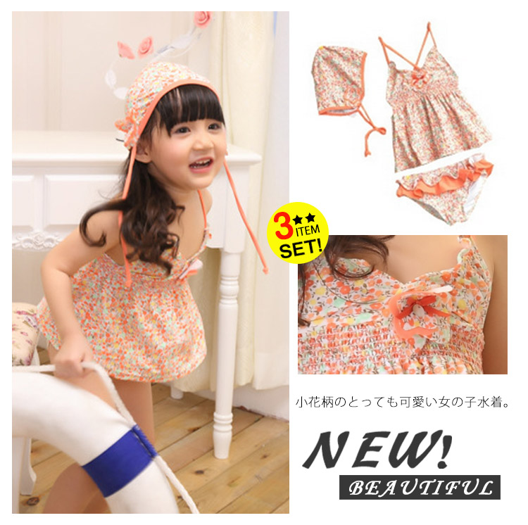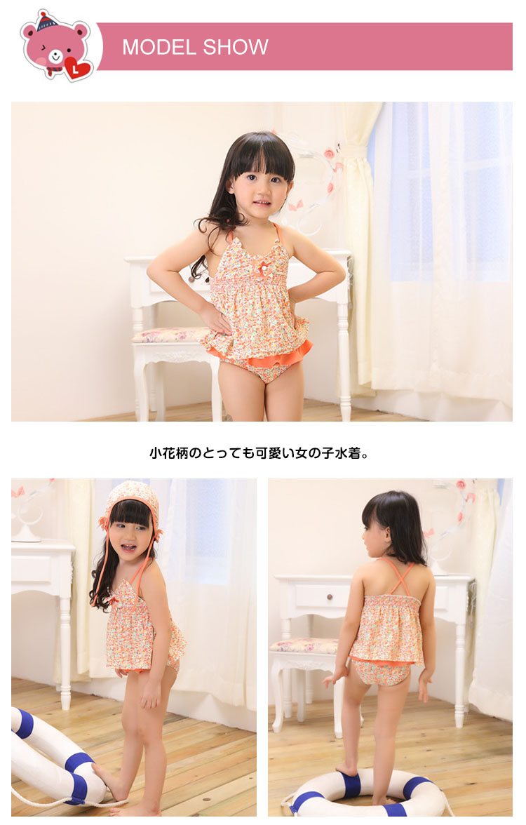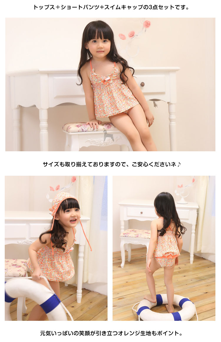 | 小花柄のとっても可愛い女の子水着。トップス+ショートパンツ+スイムキャップの3点セットです。元気いっぱいの笑顔が引き立つオレンジ生地もポイント。サイズも取り揃えておりますので、ご安心くださいネ♪ | |