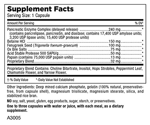 HELPS WITH DIGESTION: Betaine HCI, helps stimulate the production of hydrochloric acid. Pancreatin - a mixture of enzymes originating in the pancreas, helps break down proteins, carbohydrates, and fats. Pancreatin does its best work in an alkaline setting such as that found in the small intestine.