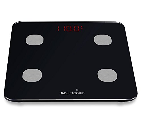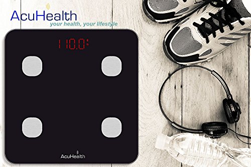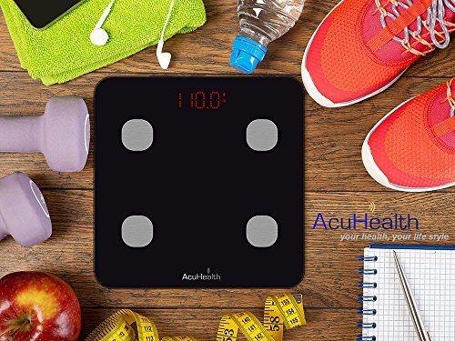 -. Feature : 10 PRECISION PHYSICAL HEALTH MEASUREMENTS - AcuHealth Smart Body Fat Scale monitors Body Weight, Body Water, Body Fat, BMI, BMR, Muscle Mass, Bone Mass, Visceral Fat and Physiological Age, great fitness monitor for healthy weight loss tracking. / BLUETOOTH 4.0 CONNECTIVITY - Compatible with iOS and Android smart phone Mobile Devices - Stores and displays body measurement histories for up to 10 different users with graphical diagram. Support Android 4.3 and IOS 6.1 and up. / INSTANT SETUP - Download the App by scanning QR code or visit the App store, connect to the "AcuHealth" app wirelessly to further track an assortment of other body indexes and store all readings. / MASSIVE 10 USERS TRACKING MANAGEMENT - AcuHealth digital smart body fat scale tracks up to 10 users at a time that works flawlessly with AcuHealth App. Break down fat loss and fortify exercise routines with individualized graphs and charts. / HIGH QUALITY AND STYLISH DESIGN - More than a high-quality fat loss tracker or weight scale, it also boasts crystal clear 3.3" backlit LCD display. The elegant and artistic design is truly for dressing room, bathroom, kitchen and home decor. A great item for personal use or as a gift for friends and family members.