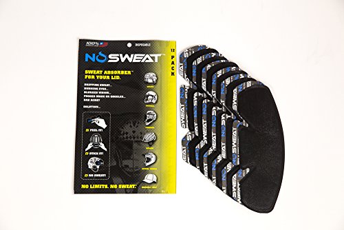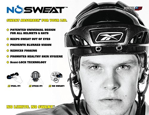 Studio : No Sweat Publisher : No Sweat Binding : Misc. Product Description No Sweat ® Hockey Helmet Liner No Sweat ® is a disposable Liner / Sweat Absorber that sticks on the inside of ANY helmet, hat, cap or LID and soaks up sweat so you do NOT have sweat dripping down onto your face and into your eyes, glasses, mask or half shield. CURRENTLY USED BY EVERY NHL OFFICIAL/REFEREE! NHL Players and Officials use NoSweat every time they play, practice or train. Great for all ages and levels. Hockey players of all ages and levels are currently using NoSweat for games, practices and training. Fits great in helmets and any other type of hat / LID used for training. NoSweat's patented design and Dri-LIDTM technology is engineered to absorb forehead sweat and clear your line of vision. Allowing you to keep your eye on the prize and take your game to a whole new level. No ScentTM technology helps prevent stains and eliminate odors, keeping your LID Cleaner. Fresher. Longer. ? Keeps sweat out of your eyes glasses ? Reduces FOGGING in glasses, half shields and masks. ? Prevents NASTY Sweat Stains on your LID ? No ScentTM Technology -- Reduces Odor ? Patented universal design -- Sticks inside the front and/or back of any LID ? Comfortable -- Thin, soft, and lightweight. ? Hypoallergenic -- Helps prevent acne skin irritation ? 100% AMERICAN MADE 0