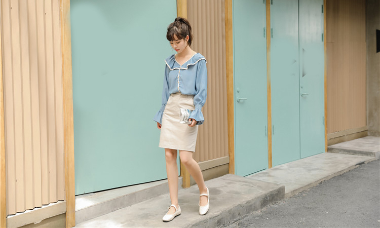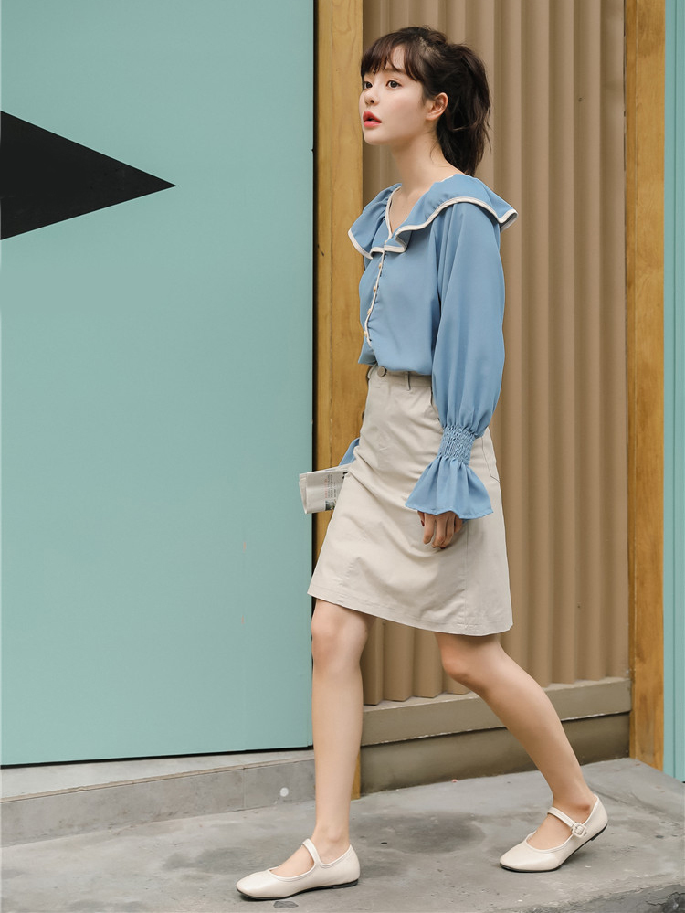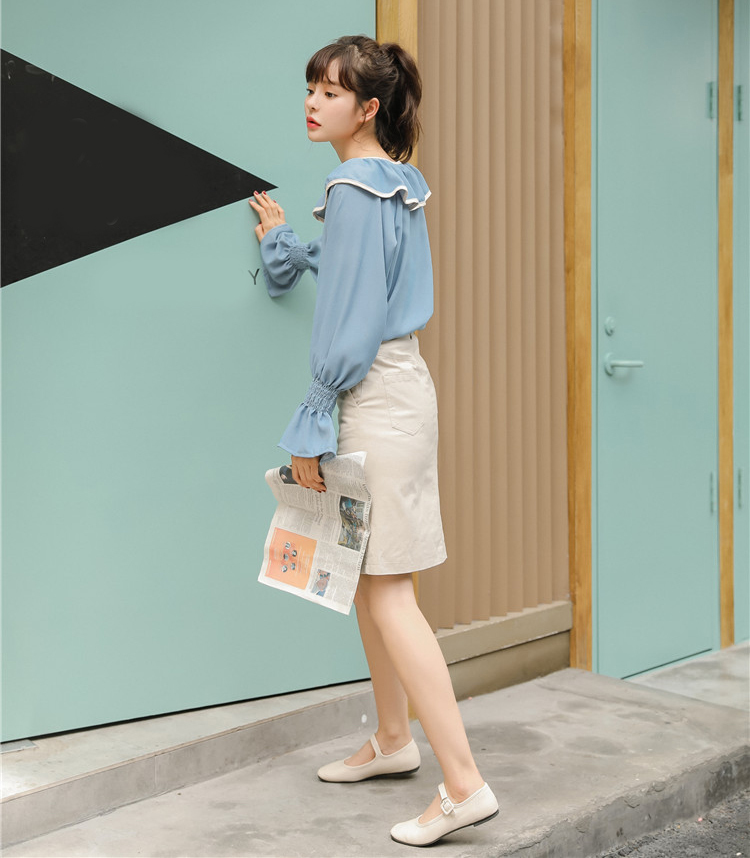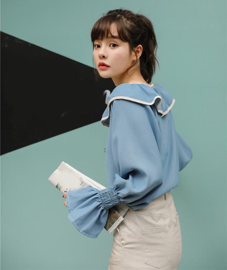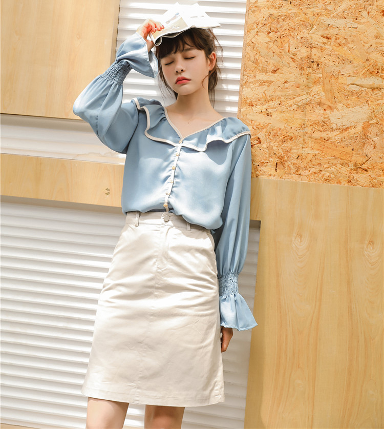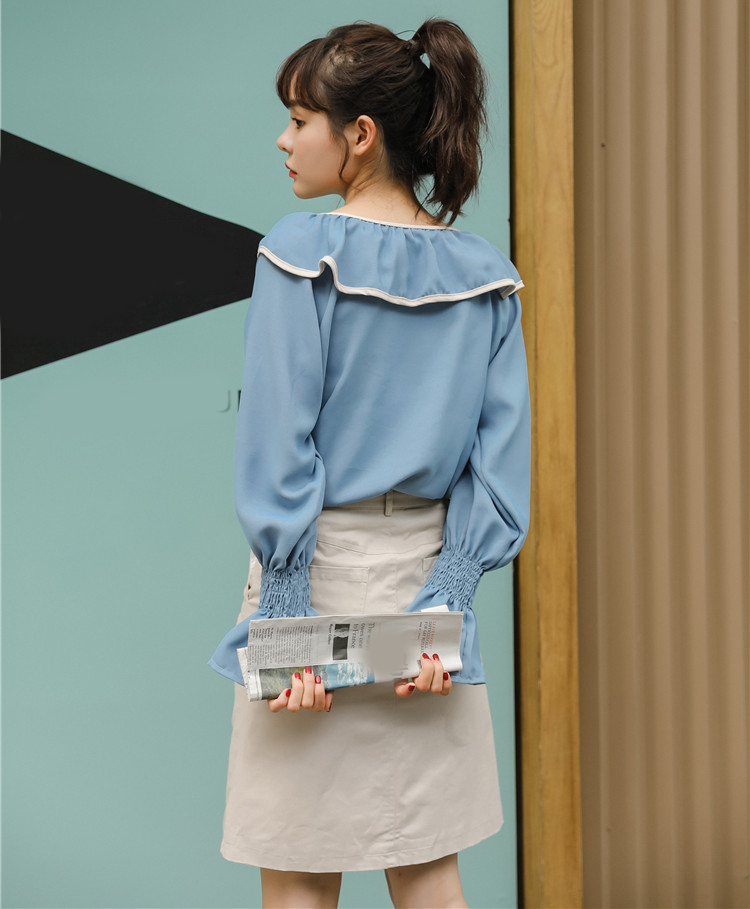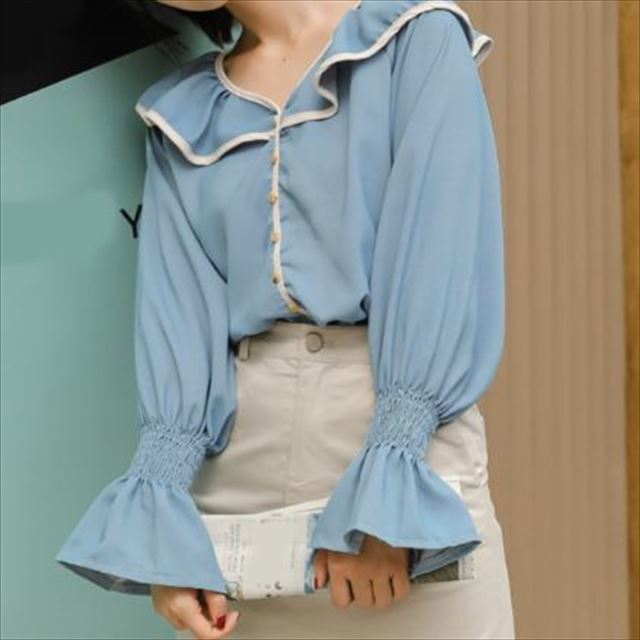 襟元と袖のふわりとした大きめフリルがフェミニンなシンプルな長袖ブラウスです。