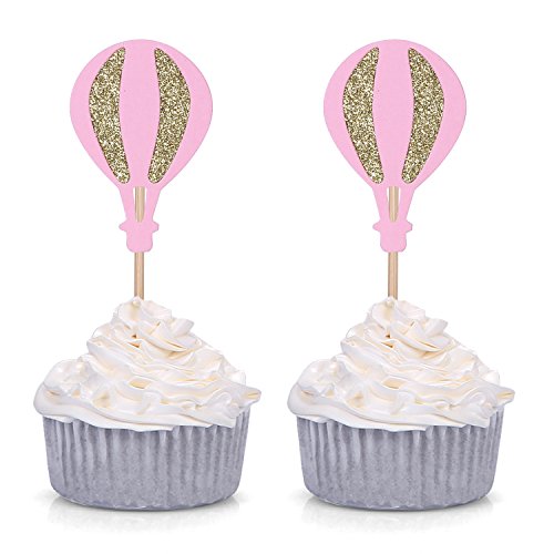 Set of 24 Pink and Golden Hot Air Balloon Cupcake Toppers Party Decorations UP UP - by Giuffi