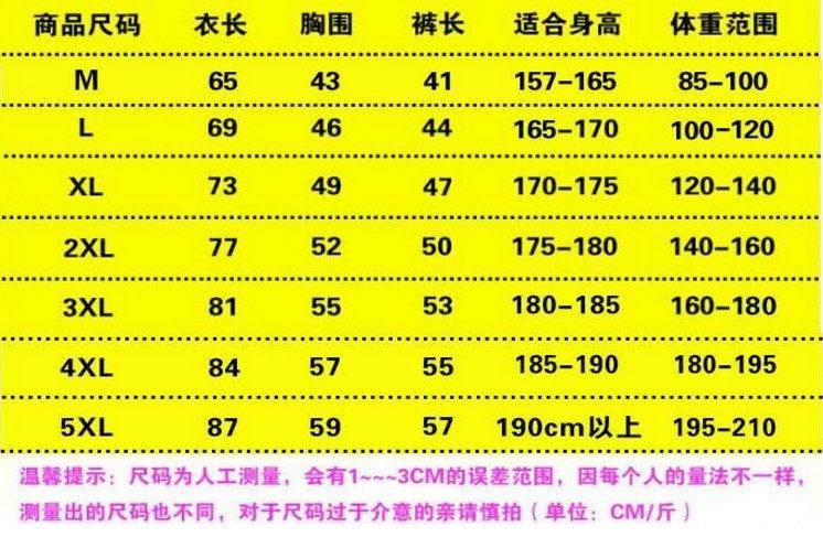 尺码: M(85-100斤) L(100-120斤) XL(120-140斤) 2XL(140-160斤) 3XL(160-180斤) 4XL(180-195斤) 5XL(195-220斤)