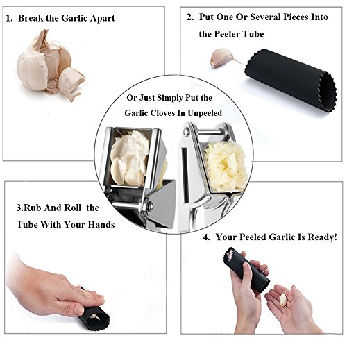 - ALL INCLUSIVE GARLIC PRESS BUNDLE: Along with your new heavy duty stainless steel garlic press, you will also receive a smart peeler silicon tube and a cleaning mini-brush. That’s everything you’ll ever need, neatly and conveniently packed into a single bundle!