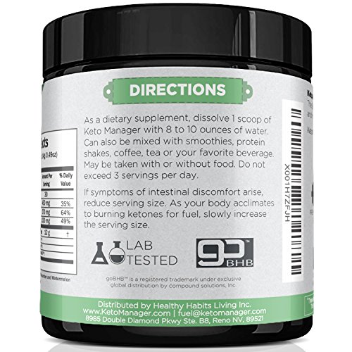 -. Feature : SEAMLESS KETOSIS -Keto Manager bridges the gap between a sugar burning and a fat burning metabolic state. The time required for this metabolic transition can be physically and mentally inconvenient. Keto Manager solves that problem and allows you to quickly and easily reach ketosis. Our patented exogenous ketones (goBHB) raise blood ketone levels within minutes. Ketones improve mental acuity, athletic performance, and weight management. / WHEN - Keto Manager may be used to replace any meal or consumed 15 minutes before exercise. / ZERO JUNK - Keto Manager contains NO carbs, NO caffeine, NO stimulants, and NO sugar. It is thoroughly tested for purity and sweetened with stevia. / EASY TO USE - Enjoy Keto Manager in water, smoothies, protein shakes, coffee, tea or your favorite beverage. The powder mixes easily with a fork or blender. The natural flavors don't leave a metallic or acrid aftertaste like competing products. / PATENTED BHBs - Keto Manager contains the thoroughly studied and patented ingredient goBHB (beta-hydroxybutyrate).