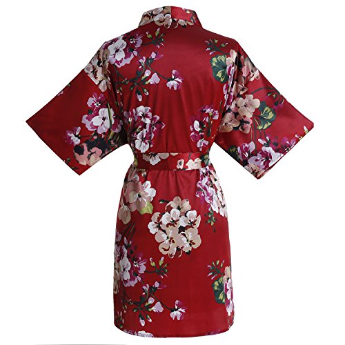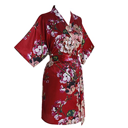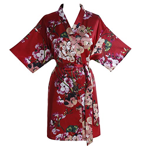 Find Dress Women's Kimono Short Robe Satin Floral Flower Sleepwear DI20008-Burgundy-M