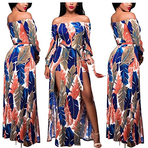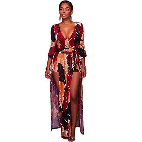 SEXY BOHO STYLE- V-Neck,Off Shoulder,Front Split,Ankle Length,One Piece,Vibrant Color Flower Print,Short pants with Sheer Overlay