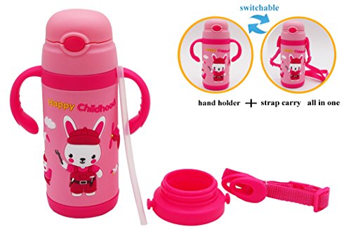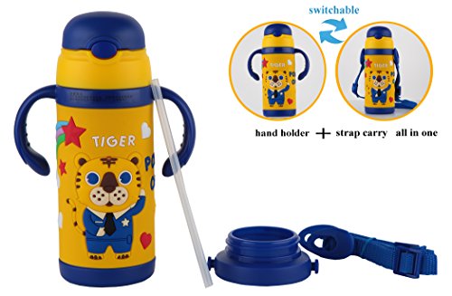 WITH 2 KINDS OF HANDLES DESIGN - A:With hand holder part, it is good for use at home. B:when outside or travel, can change to adjustable strap to carry. and the straw cap is very convenient for kids use.