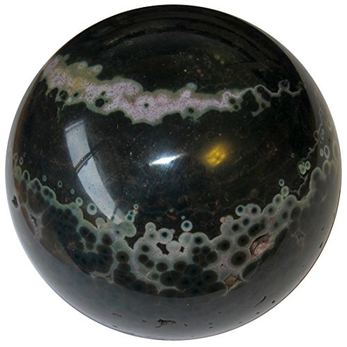 This gorgeous green ocean jasper sphere of Madagascar has natural pink and white bubbly orbicular patterns. The polished piece contains deep grooves and vugs native to this precious mineral type.