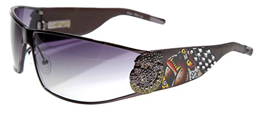 -. Brand : Ed Hardy -. Department : mens -. Feature : Rectangular shape full frame sunglasses / LA Dog graphic on temples with swarovski crystal datail / Adjustable nose pads for added comfort, 100% UV protection / Original Ed Hardy embroidered artistic case Included / Measurements: eye: 80, bridge: 13, Temple: 115 mm -. Model : EHS018 -. ProductGroup : Apparel -. ProductTypeName : EYEWEAR -. Title : Ed Hardy EHS-018 LA Dog Designers Sunglasses
