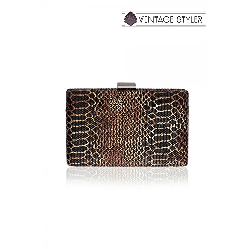 Product Description This clutch is a super glamorous box clutch bag covered in a bronzed snake effect fabric and tiny sequins for subtle sparkle. This clutch comes with a detachable strap and will fit an iPhone inside. 0