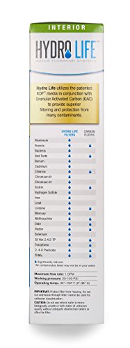 The Hydro Life filter utilizes the patented KDF media in conjunction with granular activated carbon (GAC) to provide superior filtering and protection from many contaminants. Fine mesh activated carbon provides safer, cleaner, better tasting water by filtering our contaminants including those that cause bad odor and taste. The EPA approved filter media, KDF, controls bacteria growth that may occur in standard carbon filters. Easily replace your push/pull under counter water filter kit without the use of tools. Working pressure range: 20-100 PSI. Maximum flow rate: 1 GPMFeature