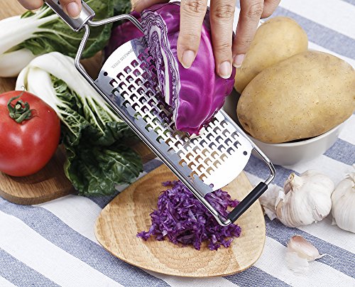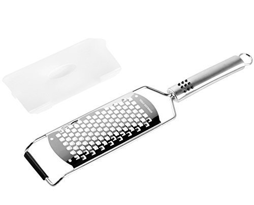Has a non-slip rubber grip just above its head to keep it steady on a tabletop during grating. 5" x 2.5" grating area . Generous size allows high performance, quick results. Blade protector to keep safe from extremely sharp blade surface