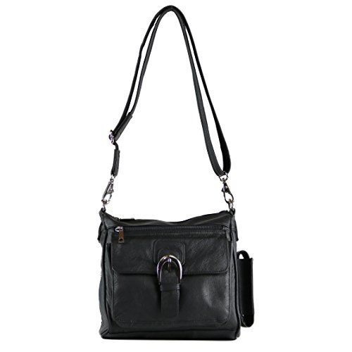 -. Brand : Roma Leathers -. Department : womens -. Feature : Premium top grain genuine leather / decorative front flap pocket with magnetic flap closure / front pocket has built-in organizer with card slots / Spacious main zippered enclosure divided into two parts by a full length zippered pocket/small zippered pocket / Dual side (ambidextrous), ballistic nylon lined, key-locking YKK zippered concealed-carry pockets / universal elastic/nylon adjustable holster included / Concealment pocket measures 5.5" x 8.5" / can accommodate large framed handguns / Purse Dimensions: 9.5" L x 10" H x 3" W (Adjustable strap - drop 13"- 24") -. ProductGroup : Shoes -. ProductTypeName : HANDBAG -. Title : Concealed Carry Purse - Organizer Crossbody Gun Bag by Roma Leathers
