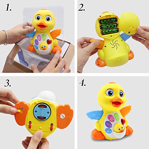 ►A LOVELY GIFT FOR ANY BABY: This dancing duck toy will keep you and your child entertained with fun sing-along tunes, wings flapping, eyes blinking, and mouth opening and closing. All of the sounds it makes are adjustable to mute, low and regular. The bright colors are fun and appealing. Make play time a fun time.For boys and girls, babies and toddlers, this makes a great Christmas, birthday or holiday present for all kids. The toy requires 3 AA batteries (not included).