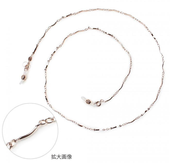 おしゃれで華やかなメガネチェーンです。 製造国:日本 素材・材質:真鍮、メッキ 商品サイズ:長さ:約70cm(ゴム輪の先から反対側のゴム輪の先まで) ※サプライヤー直送品 ご注文後3~4営業日後の出荷となります【商品名】メガネチェーン PGシリーズ(ピンクゴールドチェーン) PG-329 変形こまつなぎ Z5449