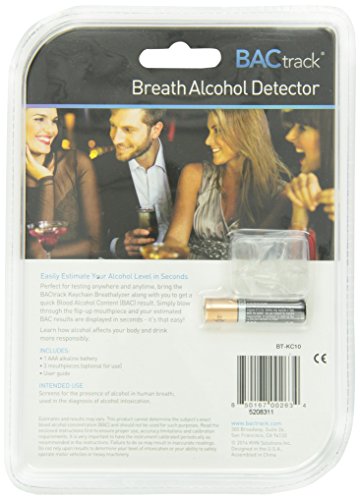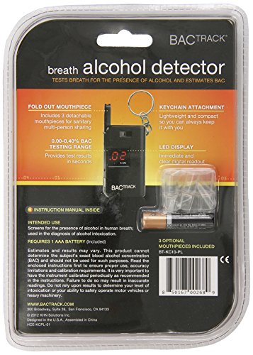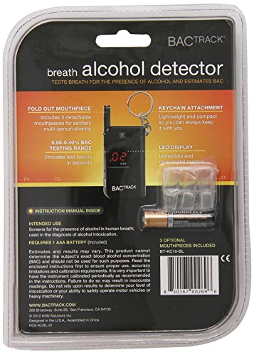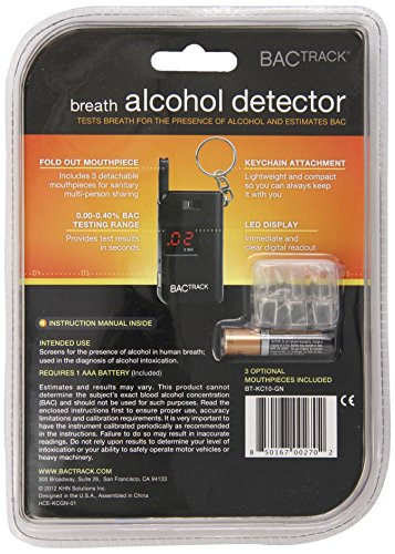 Studio : BACtrack Publisher : BACtrack Binding : Health and Beauty Product Description BACtrack Keychain Breathalyzer. The BACtrack Keychain Breathalyzer is a revolutionary portable breathalyzer that takes size and portability to the next level. The BACtrack Keychain Breathalyzer is a fully functional breath alcohol tester with an internal alcohol sensor, folding breath tube, and even optional mouthpieces. You can quickly and easily estimate your BAC, Blood Alcohol Content, by blowing through the mouthpiece for 5 seconds. Never before has a breathalyzer had accurate alcohol sensing technology in a design this small and affordable. You can take the product everywhere and test yourself, friends, family, or anyone who is curious about their Blood Alcohol Content. The innovative folding mouthpiece pulls out during testing and slides back down during storage - it's that easy! Everyone will want to test themselves whether you're at a party, bar, restaurant, or anywhere else alcohol is consumed. Learn how drinking alcohol affects your Blood Alcohol Content and always make smart, informed decisions. And you can trust the BACtrack Keychain Breathalyzer because of BACtrack's history and experience with personal and professional alcohol breathalyzers. Materials: Plastic. 1 AAA battery required (included). Dimensions: 1.45" L x .55" W x 2.44" H; 0.12 lbs. 0