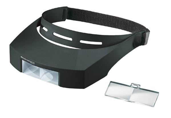 レンズの周辺が覆われているので上方と横からの光を遮断し、見ているものだけに集中できる頭に被って使うタイプのルーペです。倍率によって作業距離(焦点距離)が異なります。 |