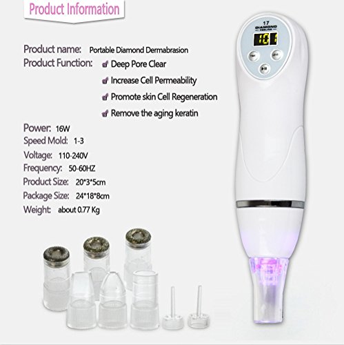 Package including:Diamond Dermabrasion Machine X 1,Diamond tips X 3, Vacuum treatment heads X 3,Filtration heads X 2,Hand Piece X 1,Power Line X 1,Vacuum Pressure: 30-50cmHg(it is not very strong,if you mind,do not buy),Speed Level: 1-3