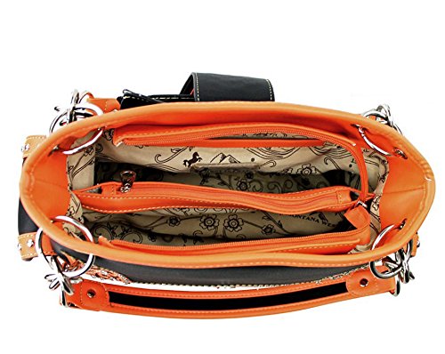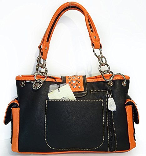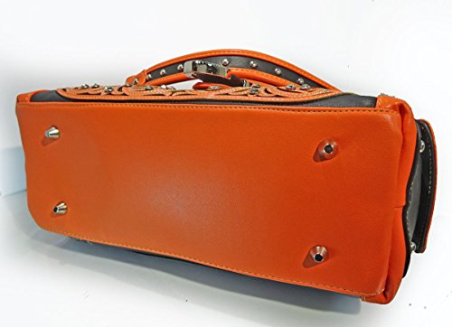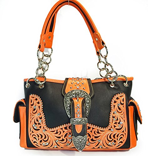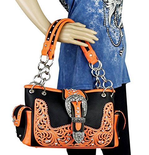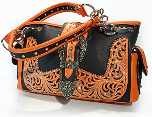 Embellished with silver antique studs, rhinestones, and floral scrolling * Silver antique longhorn belt-buckle on the flap that comes over to snap close * Zipper closure underneath