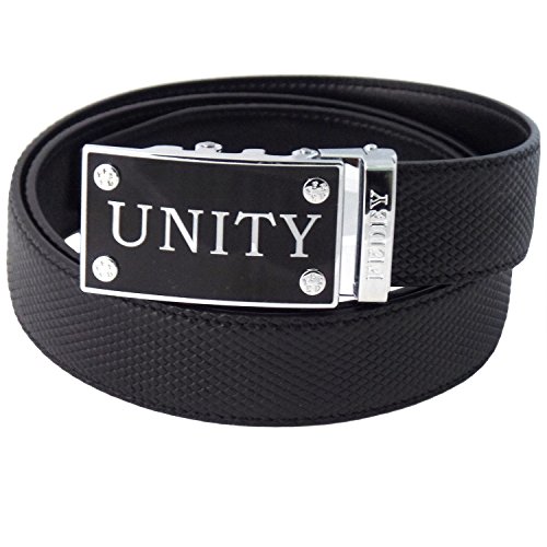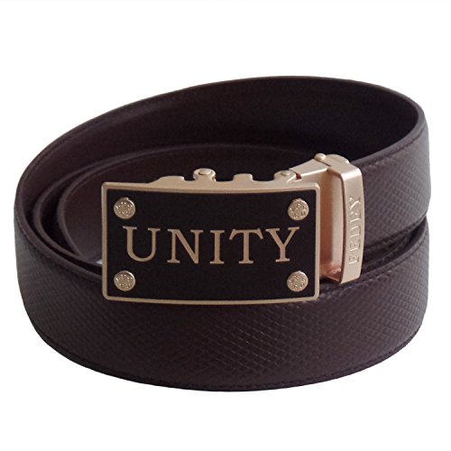 Well-crafted Mens automatic genuine leather ratchet belt with a stylish UNITY buckle. Belt strap is 1.4" (35.6MM) wide. Buckle is roughly 1.6" wide by 2.7" long