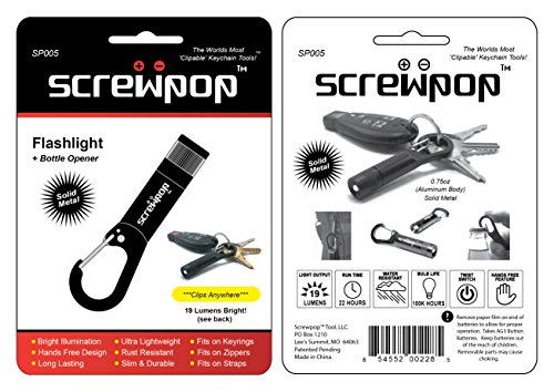 Studio : Screwpop Tool LLC Publisher : Screwpop Tool LLC Binding : Kitchen Product Description Screwpop® Tool LLC. prides itself by offering only they best in everyday carry items. Our products exceed consumer expectations with highly functional designs that are compact, durable and practical. We are known as, "The World's most Clipable Keychain Tools". And unlike many other products on the market, Screwpop® products fit nicely in a pocket, backpack, glovebox and more. Our designs easily clip to or attach onto a keyring, carabiner clip, paracord, belt loop and lanyard. Flashlight 2.0 (Model SP005) Measures: Size - 1/2″ x 1" x 3 1/8″ and weights approximately 0.7oz. All metal construction for a lifetime of use. Includes extremely bright 19 lumen LED bulb with 100k life. Other handy features include: - twist on / off function - ultra light anodized aluminum body - carabiner clip - bottle opener 0