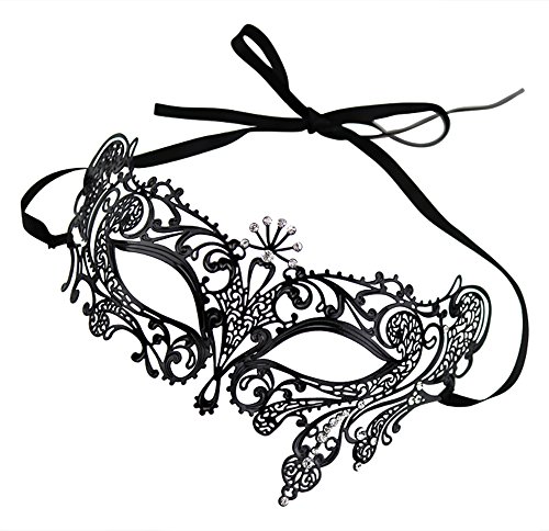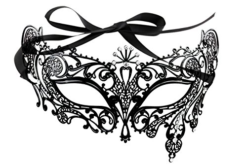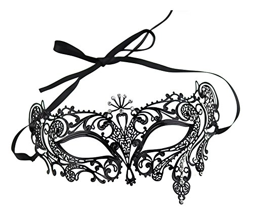 -. Brand : Maskette -. ClothingSize : 1 size fit all -. Color : Black -. Department : womens -. Feature : Composed of lightweight metal for maximum comfort / Filigree metals are soft and bendable so they can be easily adjusted to face / Unique laser cut design adorned with brilliant cut crystal rhinestones / Secured with 2 ribbons for perfect fit / Great for Halloween, Mardi Gras, masquerades and parties -. Model : MK-5032 -. PackageQuantity : 1 -. ProductGroup : Apparel -. ProductTypeName : CHILDRENS_COSTUME -. Size : 1 size fit all -. Title : Halloween Royal Black Metal Filigree Venetian Mask with Rhinstones -. UPC : 845963250327