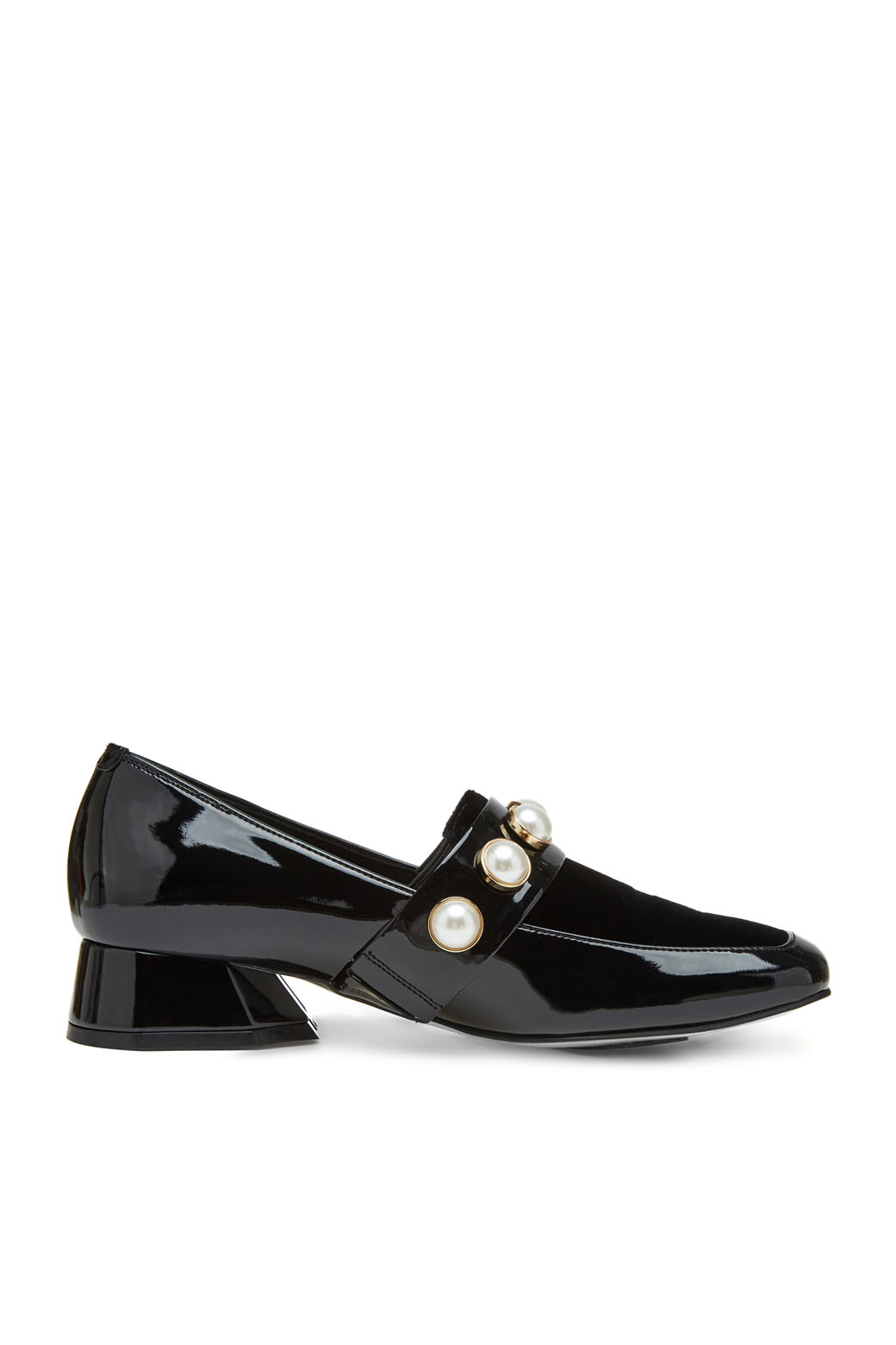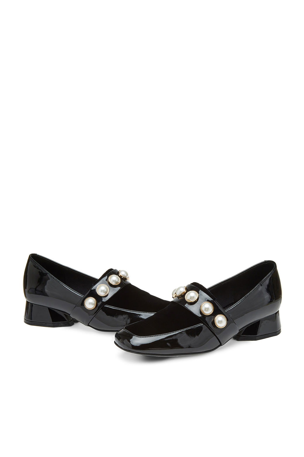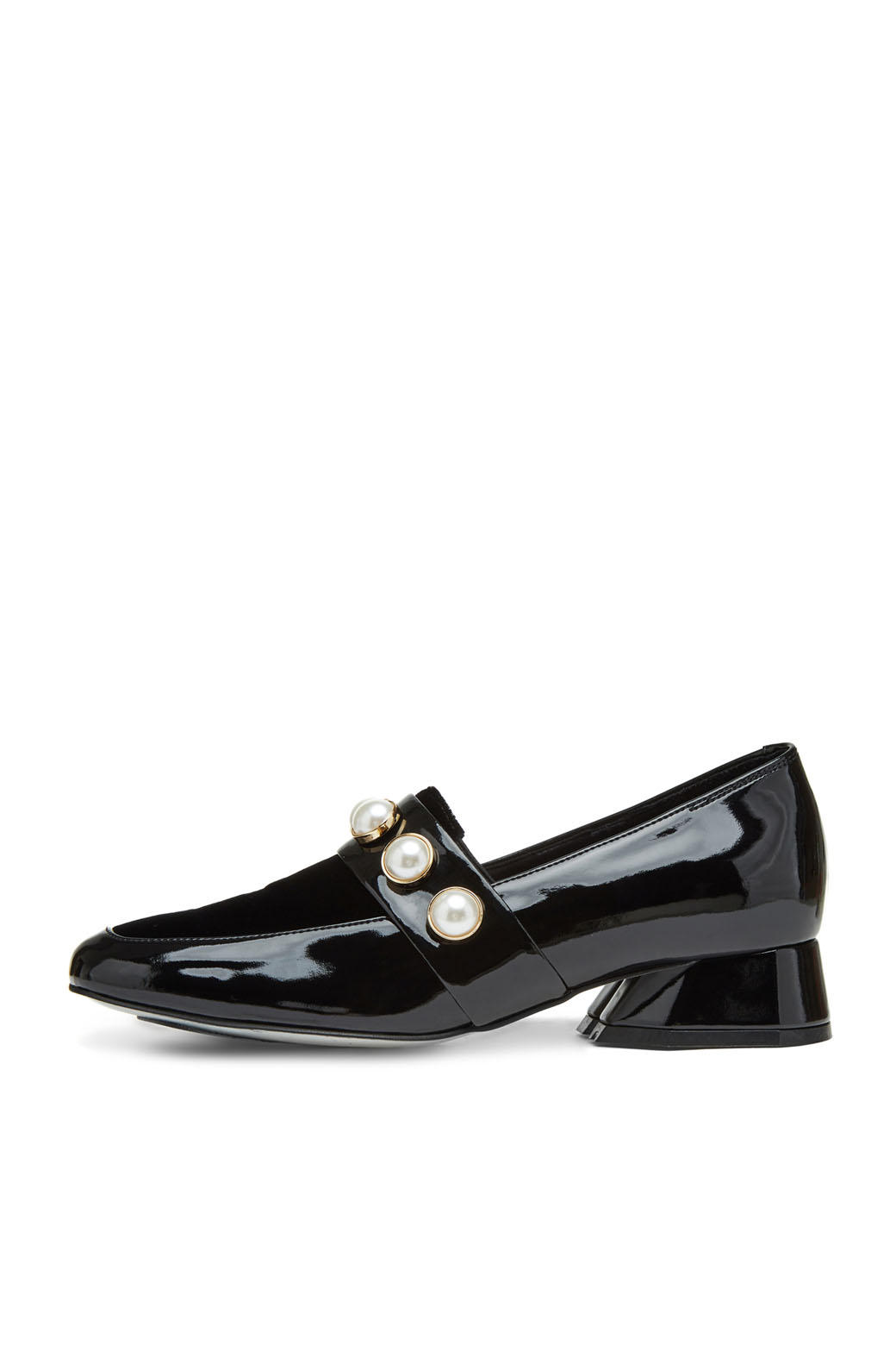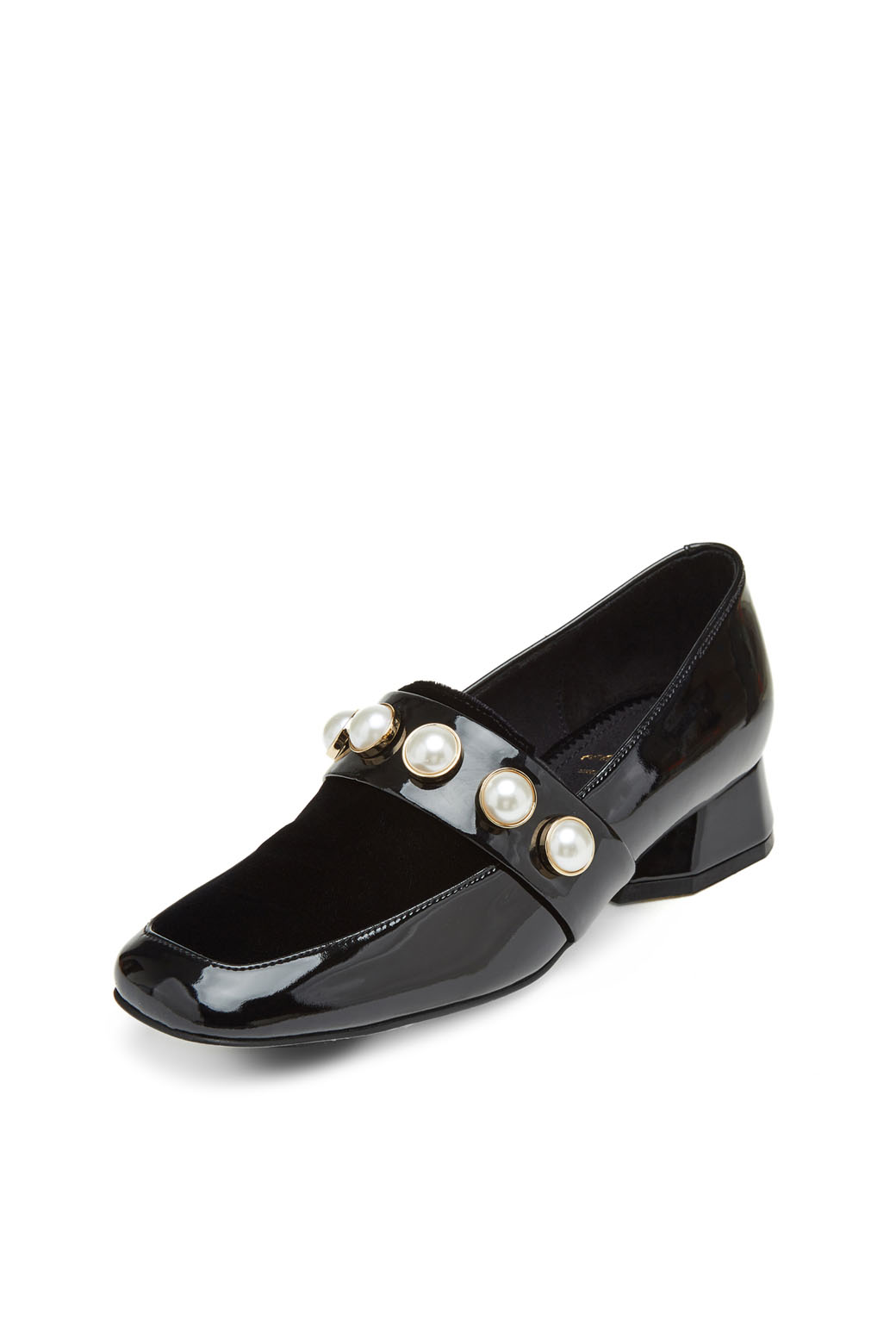 - 발등의 시그니처 진주 장식과 벨벳을 적용한 로퍼.- 스퀘어토 디자인으로 중성적인 느낌을 전해줌.- 적당한 굽높이와 쿠션감으로 우수한 착화감.- 유광택감의 페이던트 소재로 고급스러움.- 다양한 착장에 웨어러블한 연출이 가능.