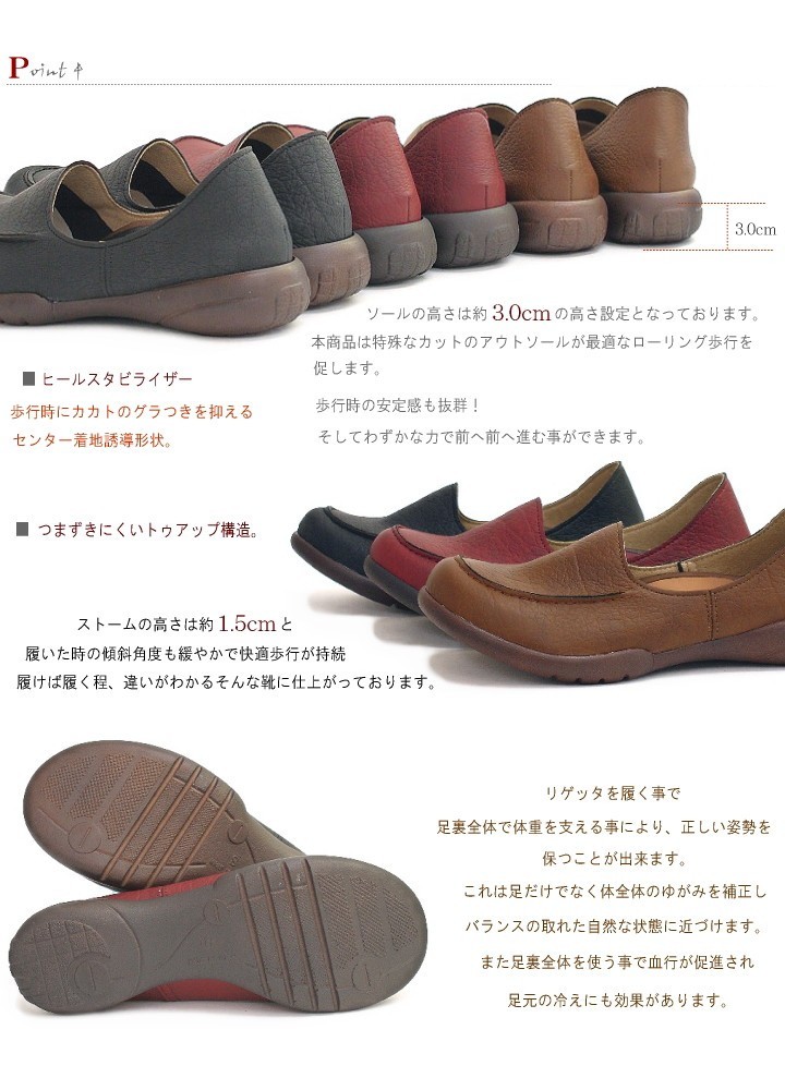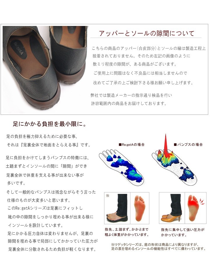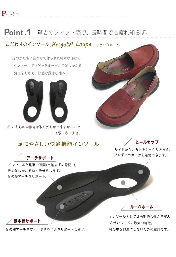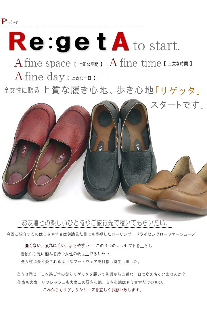 ロングセラー商品!日本製・リゲッタ・ラウンドトゥ・コンフォートローリングシューズ★信頼と安心の日本製ブランド「Re.getA」が履きやすいと、リピーター続出。 痛くない、疲れにくい、歩きやすい...この3つのコンセプトから生まれ、普段から足に悩みを持つ女性の救世主の「Re.getA」! ソールに特徴があり、足を入れて頂ければその違いにビックリ。足の裏のフィット感が心地よくソールに収まり、 履きて歩きやすく、まさにローリングシューズといえるだけあって長時間履いても疲れにくいと大好評。 まさに足裏形状に合わせたソールが足にかかる負担を最小限にしてくれるのは「Re.getA」だけ。 色違いで買われるお客様も多数いらっしゃいます。リゲッタ Re:getA レディース 靴 歩きやすい フラットシューズ ドライビングシューズ ローファー モカシン カジュアルシューズ パンプス ぺたんこ ぺたんこ靴 走れるパンプス 痛くない 黒 ブラウン レッド レディースシューズ フラット 外反母趾 お出かけ 旅行 大人スニーカー 履きやすい 大きいサイズ 23cm 23.5cm 24cm 24.5cm 25cm 20代 30代 40代 50代 60代 70代 女性 贈り物 プレゼント