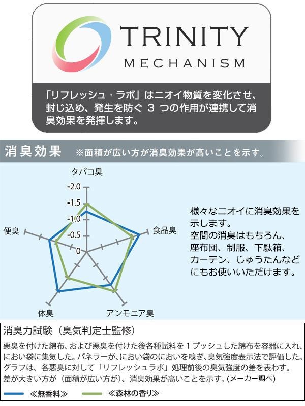 「リフレッシュ・ラボ」は気になるニオイを徹底消臭!!しかもそのまま拭き掃除にも使えるから、テーブル・イスなど、家具の表面についたニオイの元まで拭き取って除去します。除菌消臭、ウイルス除去(全ての菌、ウイルスに効果があるわけではありません)から拭き掃除までできるので作業時間短縮になります♪ |