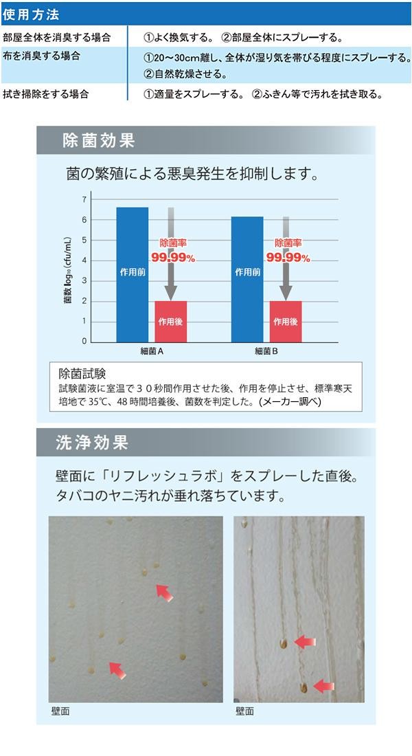 | 「リフレッシュ・ラボ」は気になるニオイを徹底消臭!!しかもそのまま拭き掃除にも使えるから、テーブル・イスなど、家具の表面についたニオイの元まで拭き取って除去します。除菌消臭、ウイルス除去(全ての菌、ウイルスに効果があるわけではありません)から拭き掃除までできるので作業時間短縮になります♪ |