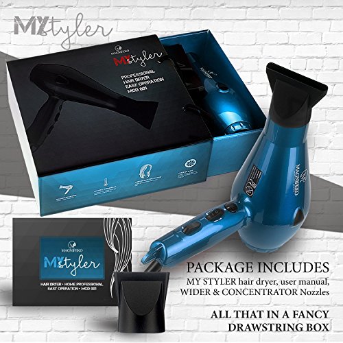 This styling professional hair dryer meets the salon shop high standard tools to dry your hair and create glamorous hairstyles to look your best. Our powerful Magnifeko blow dryer features ionic technology that neutralizes positive charges in the air to calm static electricity and its 1850W of power, this hair dryer will dry your in a snap.