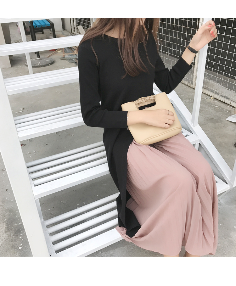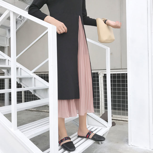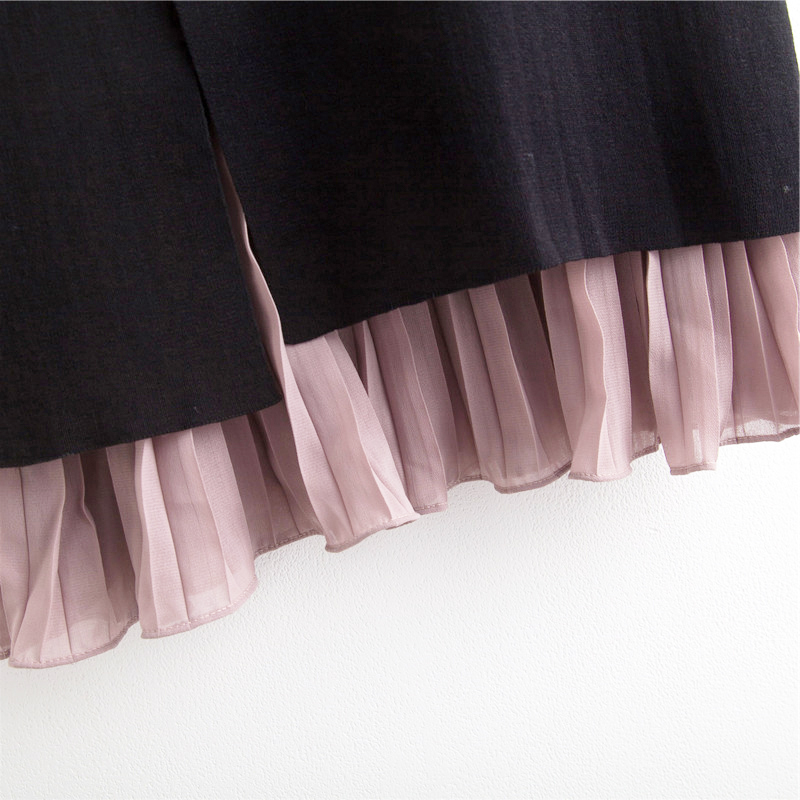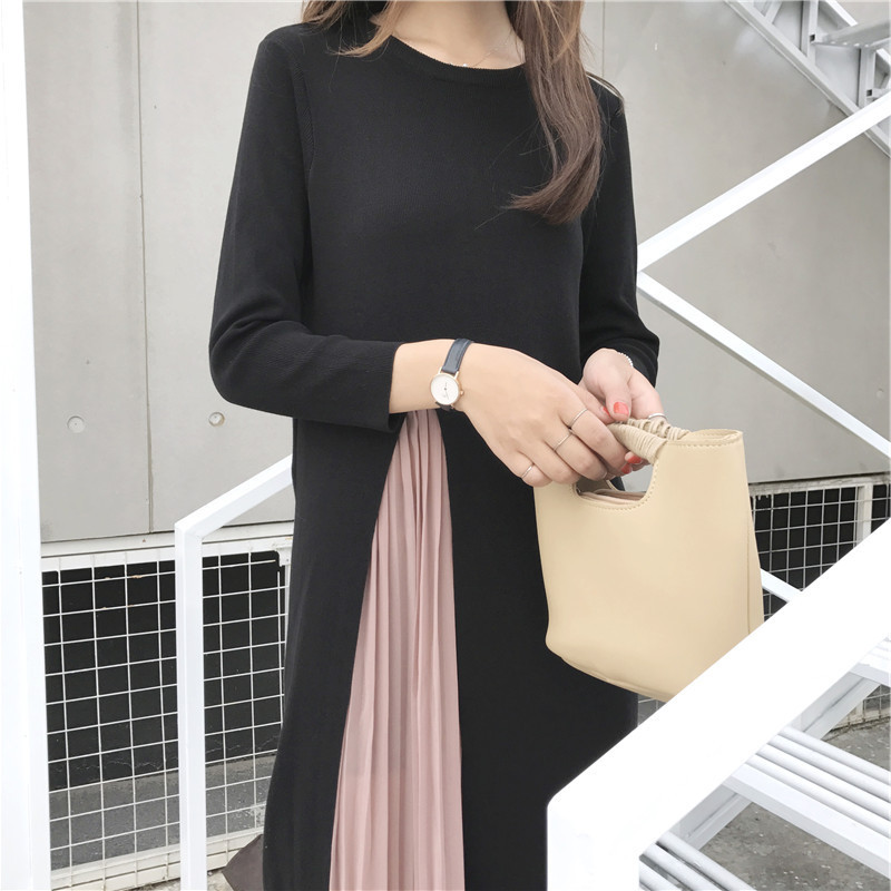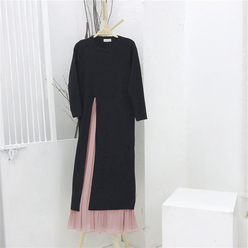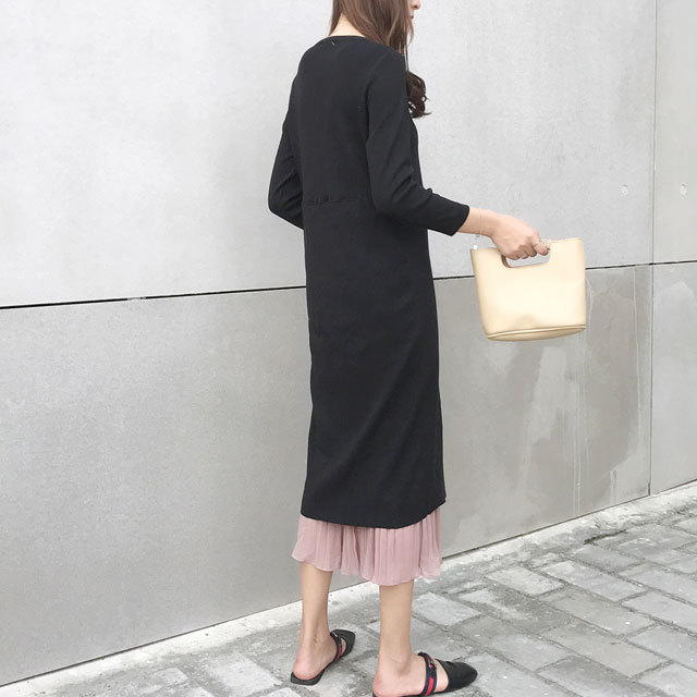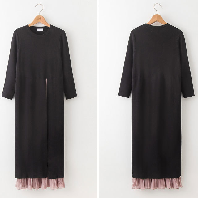 重ね着レイヤード風のクルーネック長袖ニットワンピース。