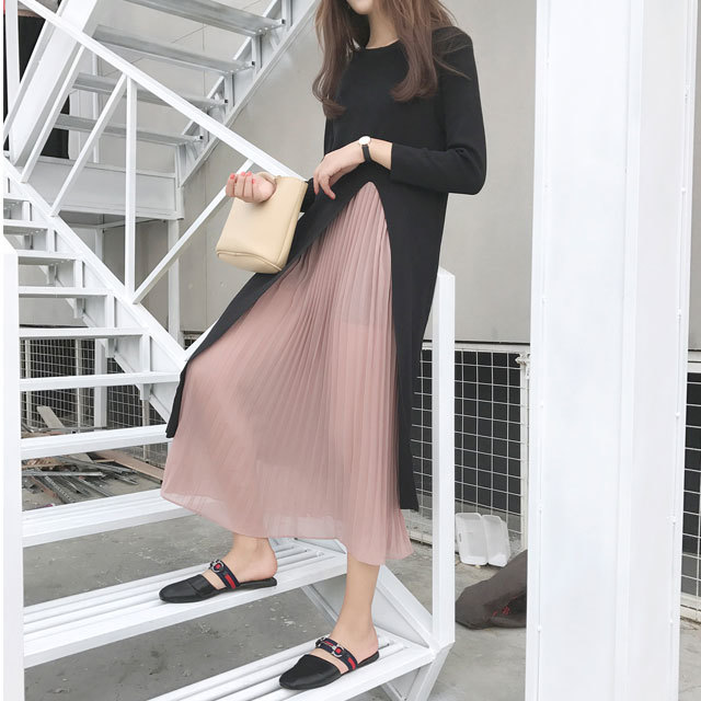 シンプルながら、シフォン素材のプリーツスカートがオシャレな印象に。