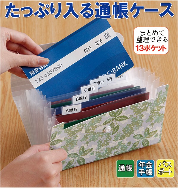 | 13ポケットで通帳やパスポートをまとめて管理。さわやかなボタニカルデザインの通帳ケース。家族のパスポートや年金手帳、お薬手帳、チケットなどを収納できます。インデックスシール付きで一目でわかる。ガバッと大きく開くジャバラポケットで取り出しやすい。旅行やイベント、お買い物にもおすすめです。 |