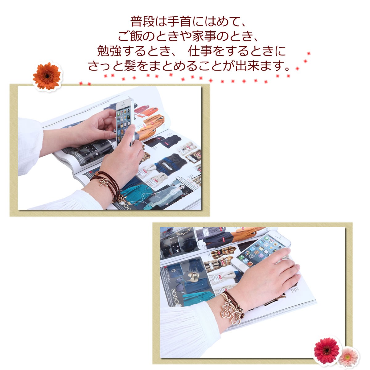 ◆普段は手首にはめて、ご飯のときや家事のとき、勉強するとき、 仕事をするときにさっと髪をまとめることが出来ます。
