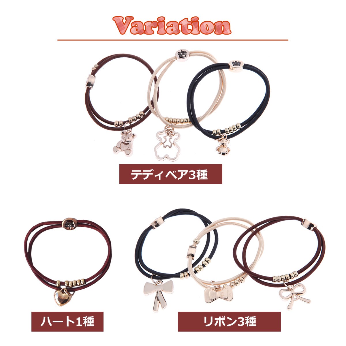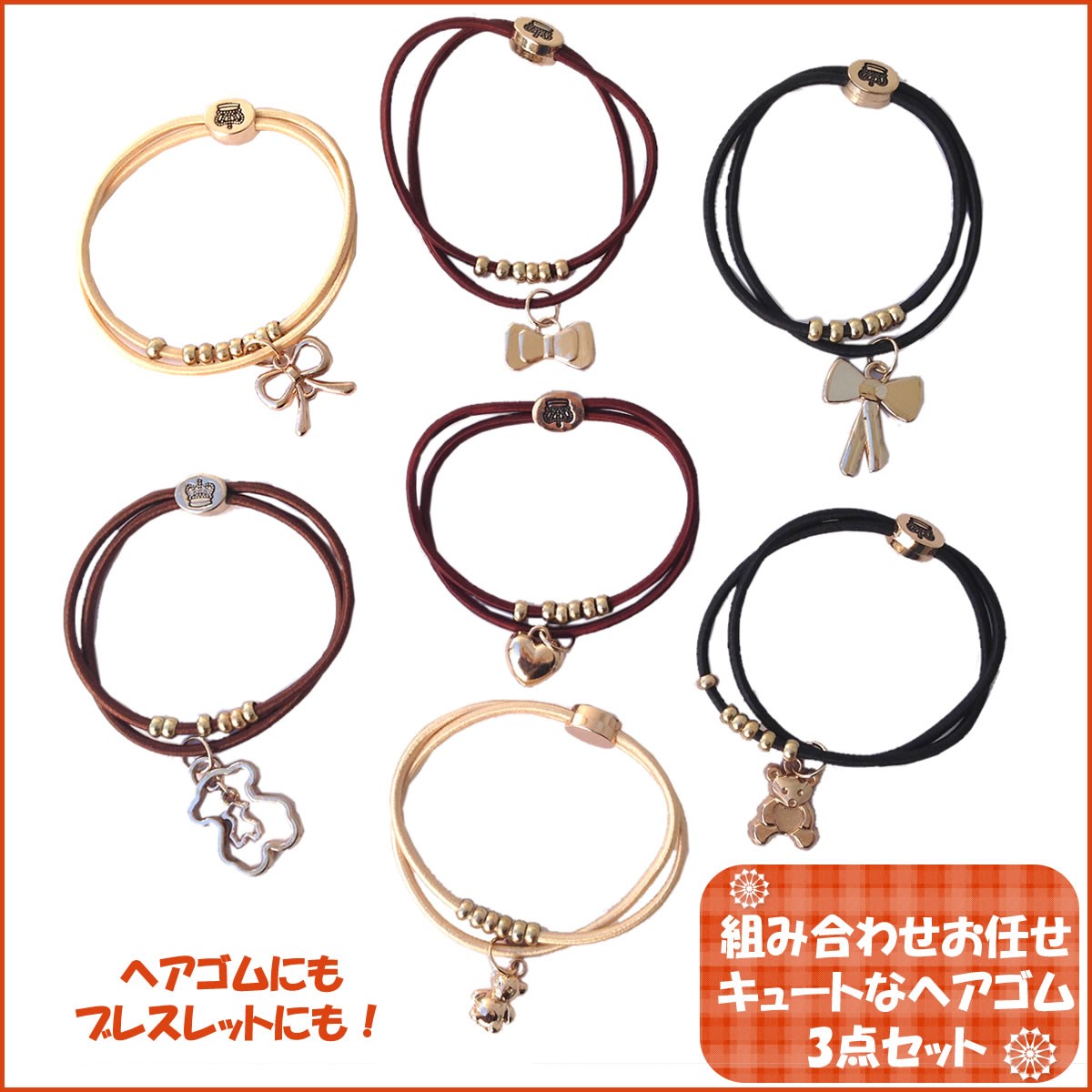 チャームの種類、ゴムの色はおまかせですが、出来る限り異なる種類のものをアレンジ致します。