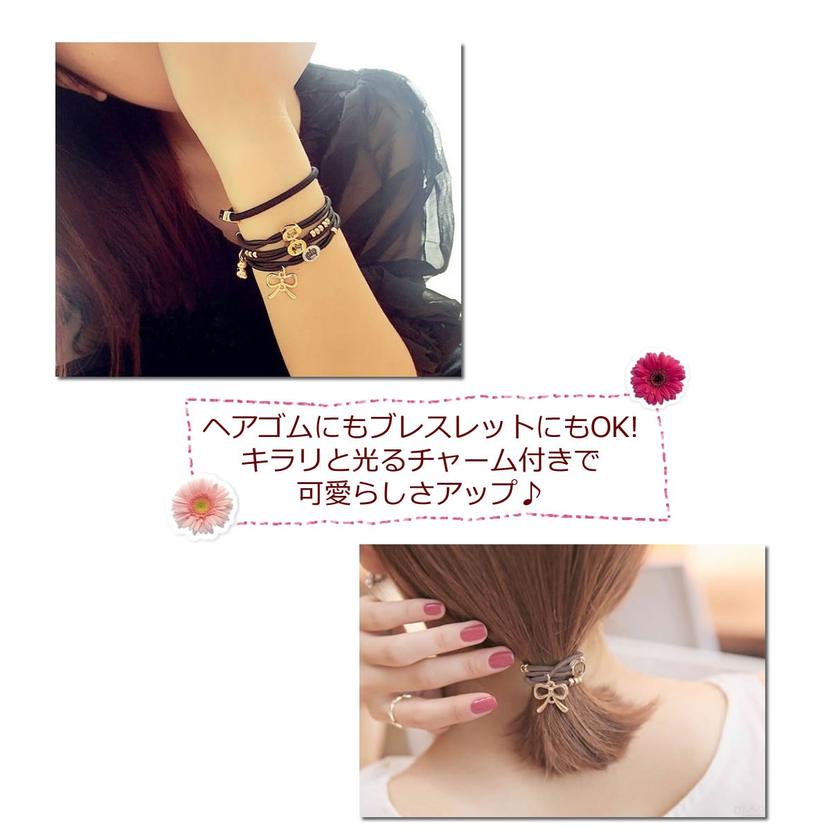 ◆ヘアスタイルにプラスするのはもちろん、 ブレスレットとして手首に付けても可愛い! お気に入りのバッグにつけてチャームとして飾るのも おすすめです。