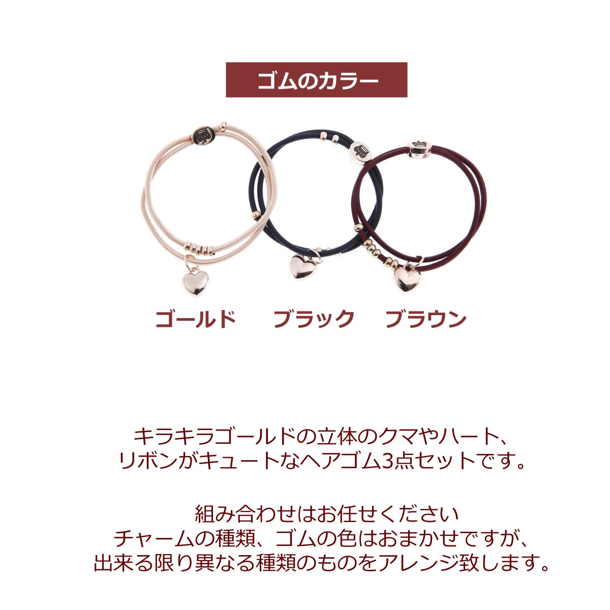 キラキラゴールドの立体のクマやハート、リボンがキュートなヘアゴム3点セットです。
