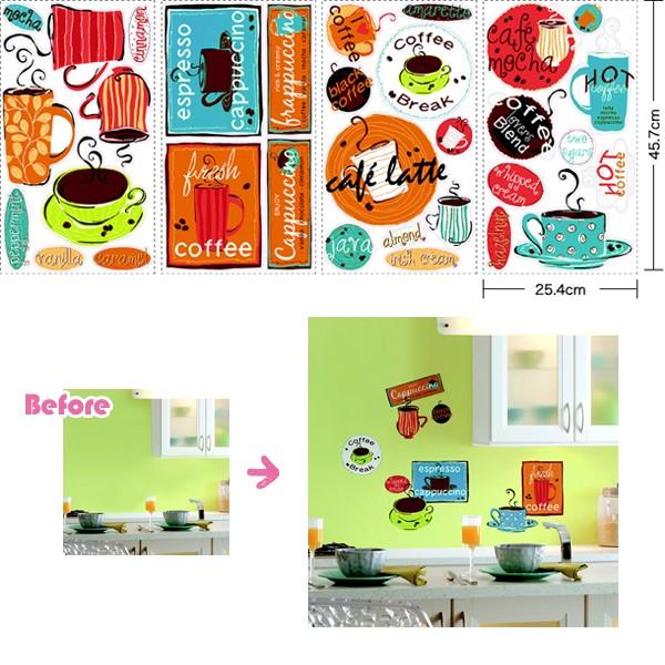 流行の[うちカフェ]テイストステッカーです。 カジュアルでポップなデザインなので、 楽しいカフェ空間を作る事が出来ます。色々なコーヒーカップやコーヒーメニューが描かれているので、カフェやレストランなどの店舗や、オフィスの休憩所などにもオススメです。 ★商品名★カフェ★商品番号★RMK1740SCS★シートサイズ★[ 25.4cm × 45.7cm ] × 4枚 ★内容★32ピース/1パック