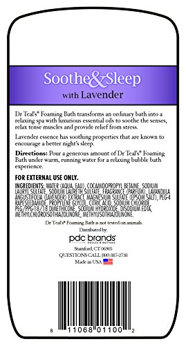-. Binding : Health and Beauty -. Brand : Dr. Teal's -. Feature : Soothe and sleep / Soothes your boyd for a deeper sleep / Nourishes your skin and your senses / Long lasting bubbles gently cleanse -. Label : Dr. Teal's -. Manufacturer : Dr. Teal's -. ProductGroup : Beauty -. ProductTypeName : BEAUTY -. Publisher : Dr. Teal's -. Studio : Dr. Teal's -. Title : Dr. Teal's Foaming Bath, 34 Ounce (Pack of 3)