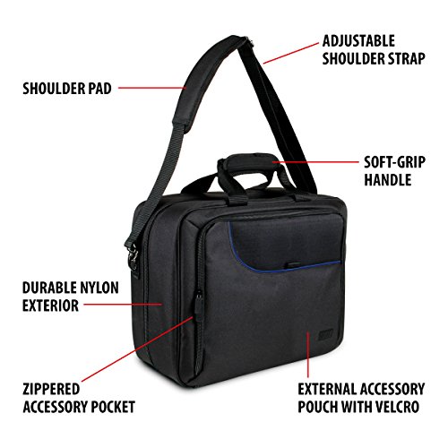 USA GEAR S13 Protective Case for Sony PlayStation 4 Pro. Durable Design - Built to last , the USA GEAR S13 Bag was designed to protect your console while withstanding the abuse of daily wear and tear. Complete with heavy-duty metal hardware , a reinforced weather-proof base , padded scratch-resistant interior and durable nylon material , this carrying case is perfect for travel or on-the-go use! Customizable Organization - The S13 provides two individual storage compartments that are separated by a secure compartment wall. On one side , there is a large space that comes with an adjustable divider and a security strap to ensure that your PlayStation 4 Pro is safety stored. The other section of the case includes several compartment dividers that allow for customizable storage for your controllers , cables , headset , games and other accessories. With plenty of internal space and 2 exterior pockets , this bag helps to keep you organized while fitting everything you need! Comfortable Portability - This highly portable bag makes carrying your console easy. Throw the case over your shoulder with the adjustable padded shoulder strap. If you'd rather carry the bag by hand , simply lift it with soft-grip carrying handle. Have confidence in your purchase knowing that it is backed by the USA GEAR 3 Year Manufacturer's Warranty! Device Compartment: 15" x 12" x 3" - Accessory Compartment: 15" x 12" x 3". Fits: Sony PlayStation 4 Pro / PS4 Pro 4KFeature