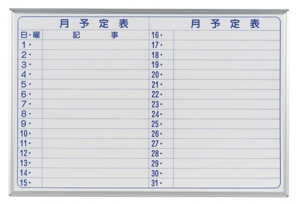ホワイトボードの予定表です。罫線で仕分けられているので予定を書き込めばひと目でわかります! |
