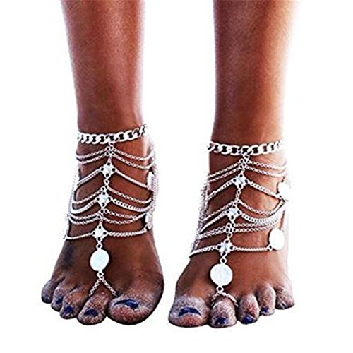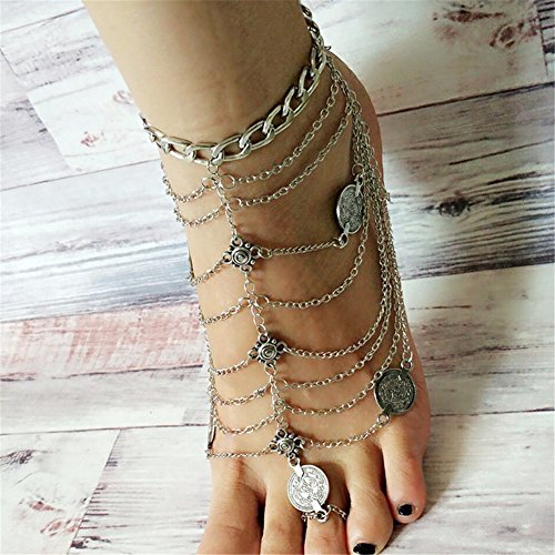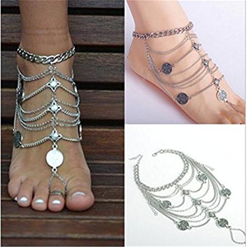 -. Title : F-U ONLY 1 Pcs Boho Vintage Silver Plated Coin Blessing Symbol Tassel Anklets Foot Jewelry for Women