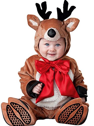 Lined zippered jumpsuit with bell accents and leg snaps for easy diaper change, hood with attached faux antlers, ears and nose and slip-on booties with skid resistant bottoms. (Booties are for indoor use only). Has black nose.Feature